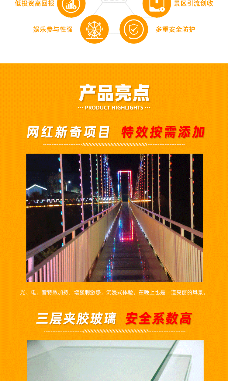根據(jù)需求可增加光影場(chǎng)景效果,給游客以聽(tīng)覺(jué)、視覺(jué)、觸覺(jué)等全方位體驗(yàn),為景區(qū)增添一抹大膽與刺激,是景區(qū)觀光景點(diǎn)最受歡迎的設(shè)施。