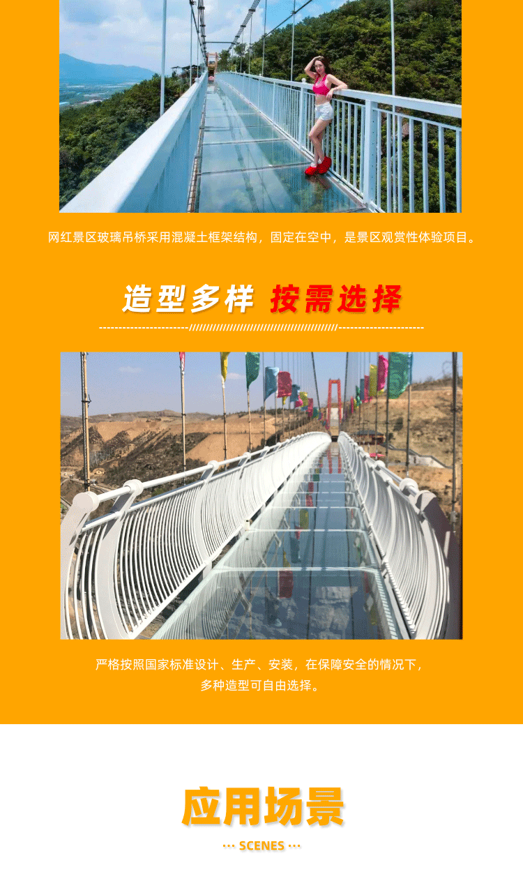 玻璃吊橋由鋼化玻璃凌空高架在兩山之間形成懸空透明的玻璃景觀橋,兼具通行、觀景、娛樂(lè)為一體,玻璃透光率高達(dá)99.15%,每走一步都像漫步在云端。