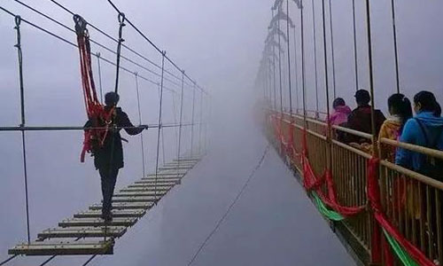 挑戰(zhàn)橋主要分為有橋面板和無橋面板兩種。橋板面可以選擇木板、蹺蹺板等多種形式,也可以選擇透明玻璃板,游客身在半空,透過玻璃俯瞰腳下,更具刺激性。無橋面板為鐵索橋,“大渡橋橫鐵索寒”,完成挑戰(zhàn)的游客可以獲得極大的心里滿足感。