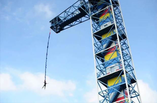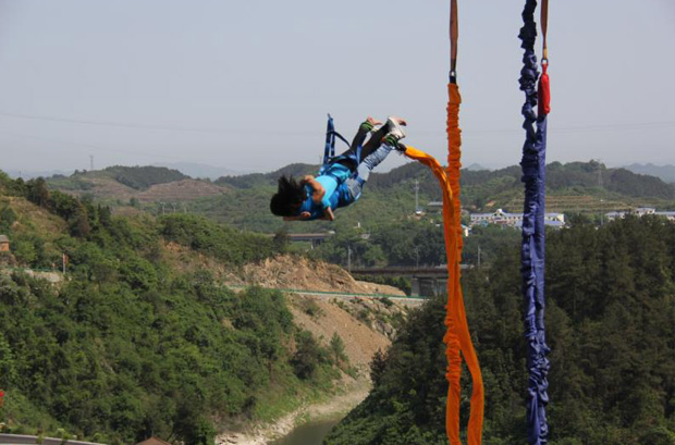 蹦極,是一項(xiàng)具有挑戰(zhàn)性、刺激性和娛樂性的現(xiàn)代體育游樂項(xiàng)目,也是近些年來新興的一項(xiàng)非常刺激的戶外極限運(yùn)動。跳躍者站在約40米以上(相當(dāng)于13層樓)高度的橋梁、塔頂、高樓上,把彈力繩綁在游客安全裝備上,兩臂伸開,雙腿并攏,完成一次“信仰之躍”。