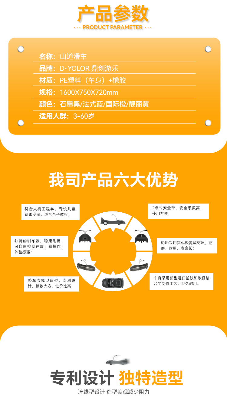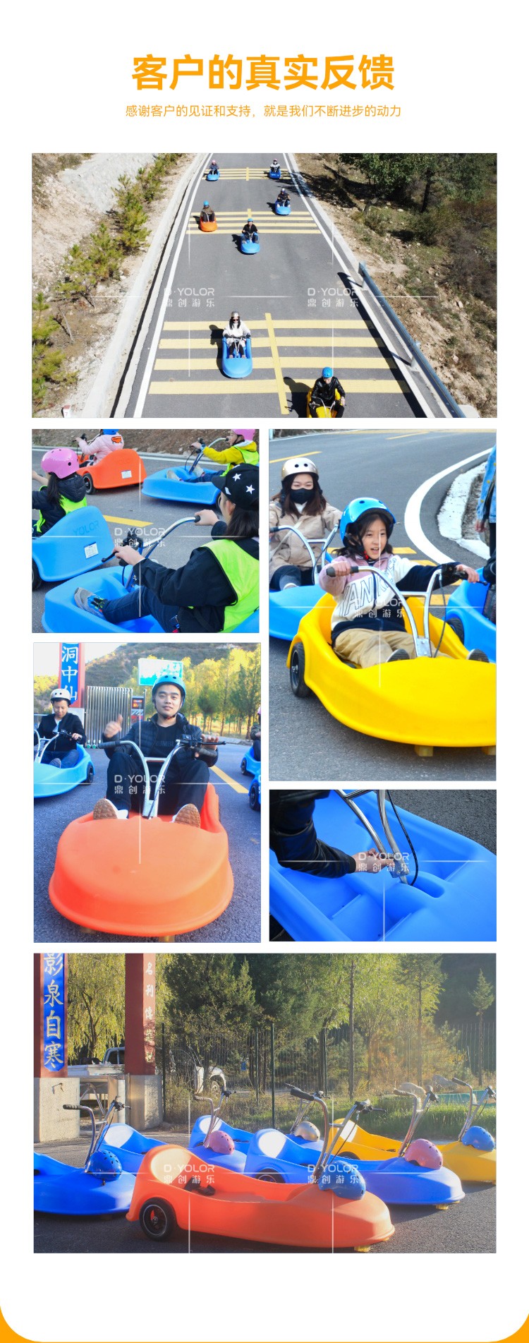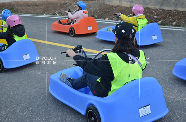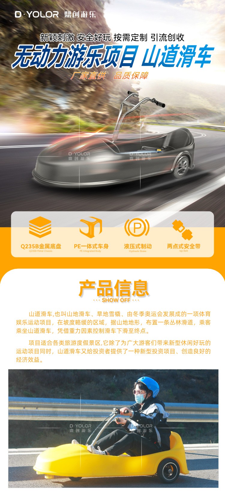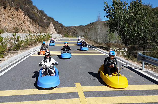 山道滑車,由冬季奧運(yùn)會鋼架雪車運(yùn)動發(fā)展成的一項休閑娛樂項目,在坡度略緩的區(qū)域,根據(jù)地形,布置一條滑道,乘客乘坐無動力滑車,利用坡度,借助重力,控制滑車滑行至終點(diǎn)。它類似于賽車,項目操作簡單,刺激而又安全,充滿參與性和娛樂性,老少皆宜,使人流連忘返。